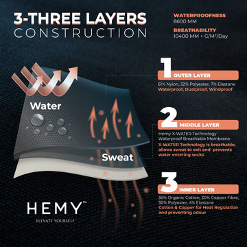 Hemy Waterproof Socks feature a cutting-edge waterproof and breathable membrane as the middle layer. This blocks water from entering while allowing moisture from sweat to escape, keeping your feet dry and comfortable in all conditions.